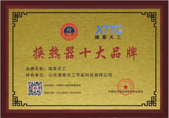 烯泰天工節(jié)能科技有限公司一直秉承"科技創(chuàng)新賦能雙碳戰(zhàn)略"的發(fā)展理念,致力于提供更集約、更高效、更可靠、更優(yōu)質、更便利的散熱系統(tǒng)解決方案。近日,我公司榮登由“中國好口碑”及“品牌315”主辦的2021換熱器十大品牌推薦榜。
