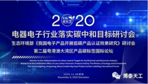 2020年11月8日,“碳標簽” 電器電子行業(yè)落實碳中和目標研討會暨生態(tài)環(huán)境部《我國電子產(chǎn)品開展低碳產(chǎn)品認證效果研究》研討會,第二屆粵港澳大灣區(qū)產(chǎn)品碳標簽國際論壇在深圳隆重舉行。