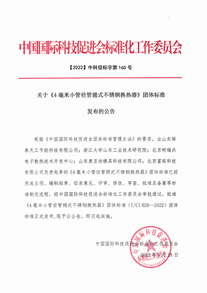 2022年4月28日,中國國際科技促進(jìn)會(huì)標(biāo)準(zhǔn)化工作委員會(huì)發(fā)布公告,由我司主導(dǎo)起草的《4毫米小管徑管翅式不銹鋼換熱器》團(tuán)體標(biāo)準(zhǔn)通過審批,現(xiàn)已正式發(fā)布。