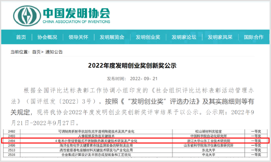2022年9月21日,中國(guó)發(fā)明協(xié)會(huì)公示了2022年度發(fā)明創(chuàng)業(yè)獎(jiǎng)創(chuàng)新獎(jiǎng)名單,浙大山工院孵化企業(yè)烯泰天工報(bào)送項(xiàng)目《4毫米小管徑管翅式不銹鋼換熱器關(guān)鍵技術(shù)研發(fā)及產(chǎn)業(yè)化》榮獲中國(guó)發(fā)明協(xié)會(huì)2022年度“發(fā)明創(chuàng)業(yè)獎(jiǎng)創(chuàng)新獎(jiǎng)”一等獎(jiǎng)。