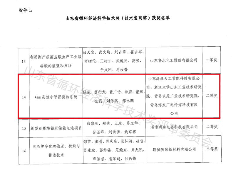 12月25日,山東省循環(huán)經(jīng)濟(jì)科學(xué)技術(shù)獎(jiǎng)評(píng)審委員會(huì)發(fā)布《關(guān)于公布2022年度山東省循環(huán)經(jīng)濟(jì)科學(xué)技術(shù)獎(jiǎng)授獎(jiǎng)結(jié)果的通知》,經(jīng)組織專家最終評(píng)審,共38項(xiàng)技術(shù)成果獲評(píng)為省循環(huán)經(jīng)濟(jì)科學(xué)技術(shù)發(fā)明獎(jiǎng)。 其中,烯泰天工作為 “ 4mm高效小管徑換熱系統(tǒng) ” 的項(xiàng)目主要完成單位,憑借其在高效小管徑換熱系統(tǒng)的研發(fā)與產(chǎn)業(yè)化應(yīng)用方面的領(lǐng)先優(yōu)勢榮獲“山東省循環(huán)經(jīng)濟(jì)科學(xué)技術(shù)獎(jiǎng)(技術(shù)發(fā)明獎(jiǎng),二等獎(jiǎng))”。