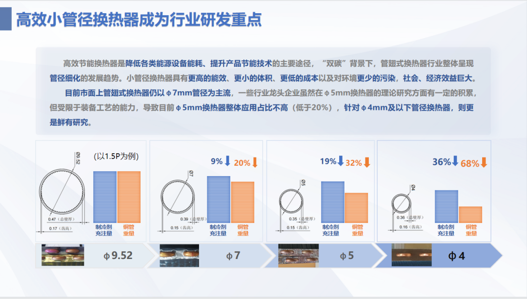 采用4mm小管徑換熱器,換熱效率較同等規(guī)格的5mm換熱器可提高20-30%,而在原材料用量方面卻可減少50-60%,同時(shí)可降低制冷劑充注量25%以上,具有顯著的經(jīng)濟(jì)效益、環(huán)保效益和社會(huì)效益。
